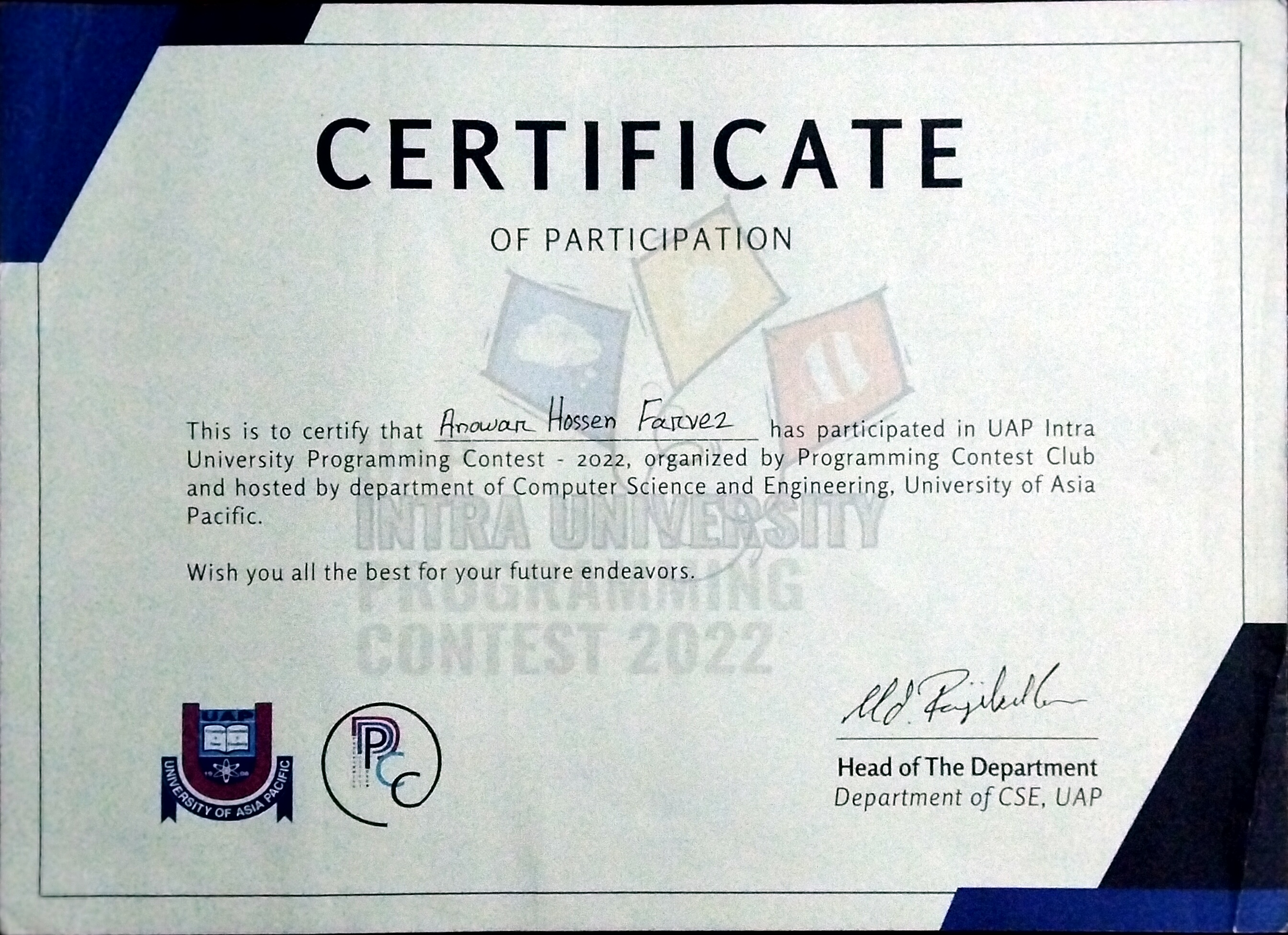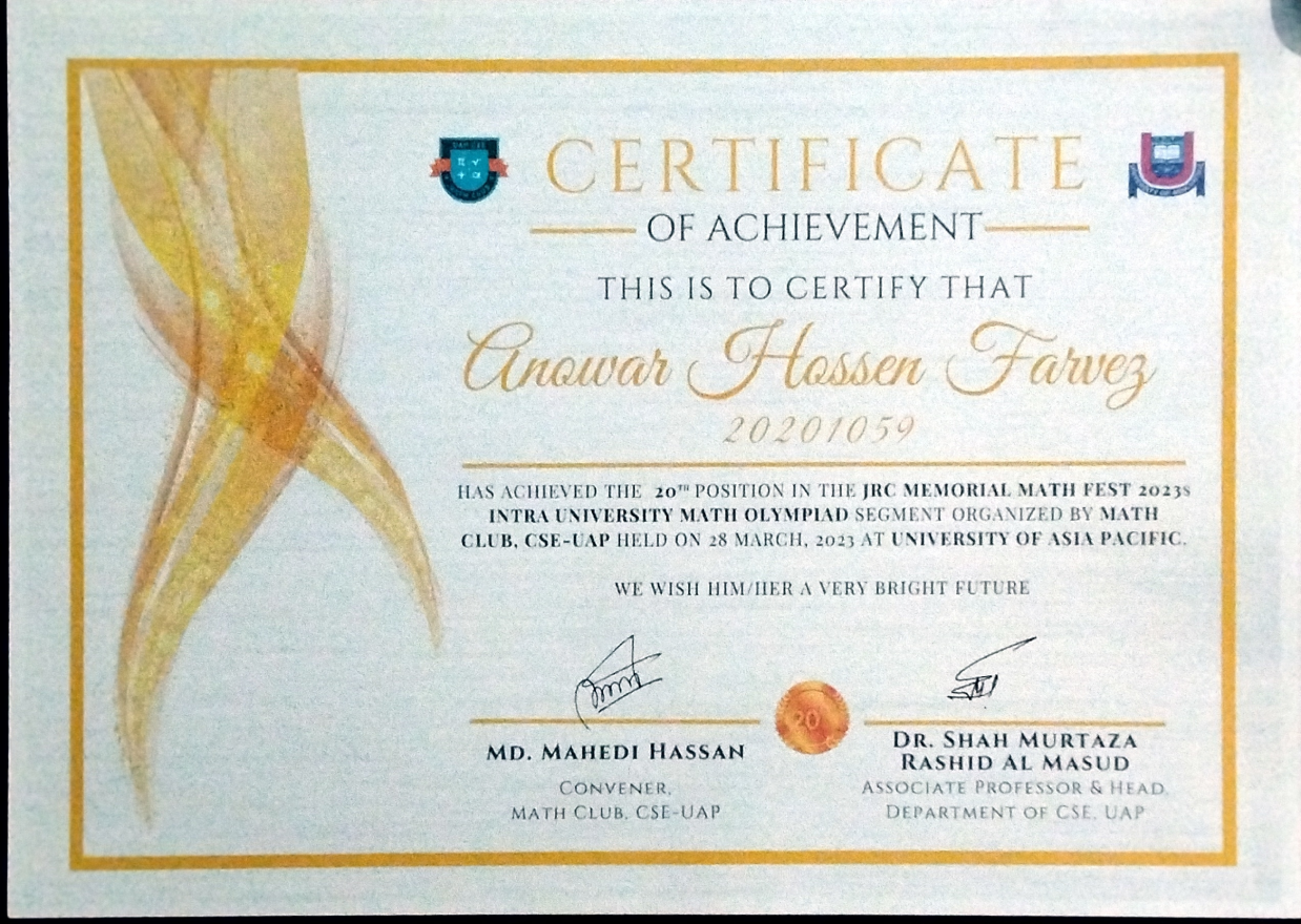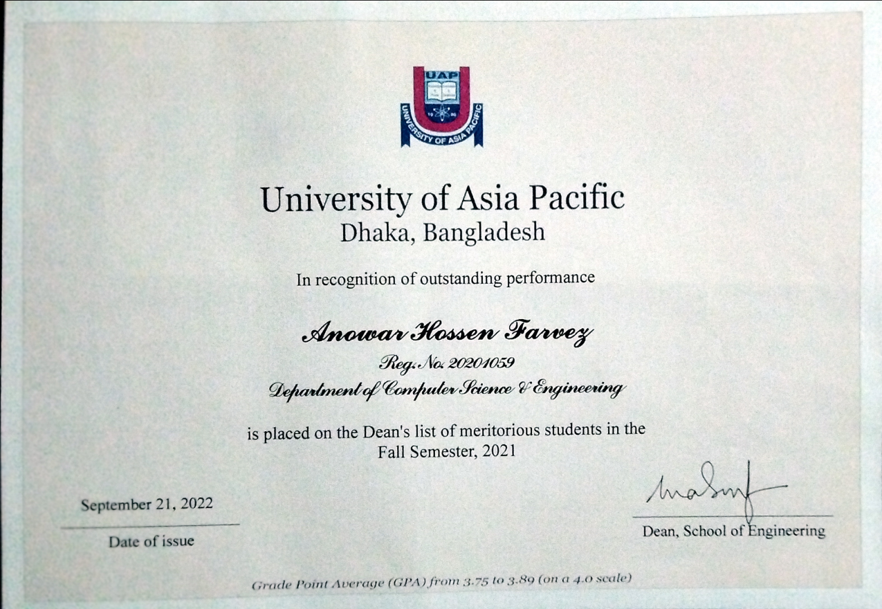 I graduated with a BSc in Computer Science and Engineering from the University of Asia Pacific (UAP), achieving a CGPA of 3.87/4.00.